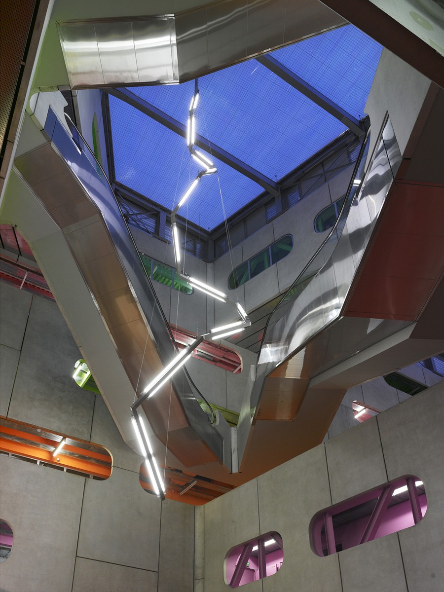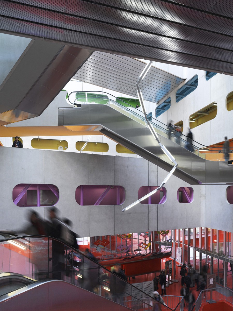 Une enveloppe unificatrice de huit panneaux micro perforés en tôle d’aluminium, composés aléatoirement en fonction de l’orientation et des différents espaces intérieurs, forme une peau sensible, épaisse et brise-soleil. Derrière cette façade ajourée, se développe dans toute la hauteur du bâtiment un spectaculaire atrium central couvert desservant l’ensemble de salles de cours ou laboratoires.