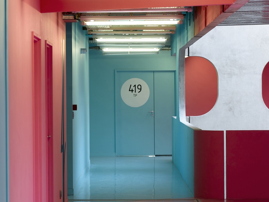 Our answer for the extension is based on the existing system, deforming it at the same time, creating two patios. One of them forms a “vertical place” that groups all the cirulations of the building. This concrete space opposes its heaviness and hardness to the light-weight metal cladding of its outer skin.