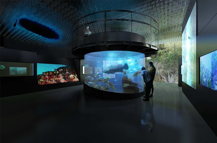 On the side of the sea, the facade is enveloped by a glass skin with multiple leans that diffract the plate Northern light. This perspective between the sea, the glass, the shiny blue shades appear to us as a convenient metaphor of the aquarium's universe.