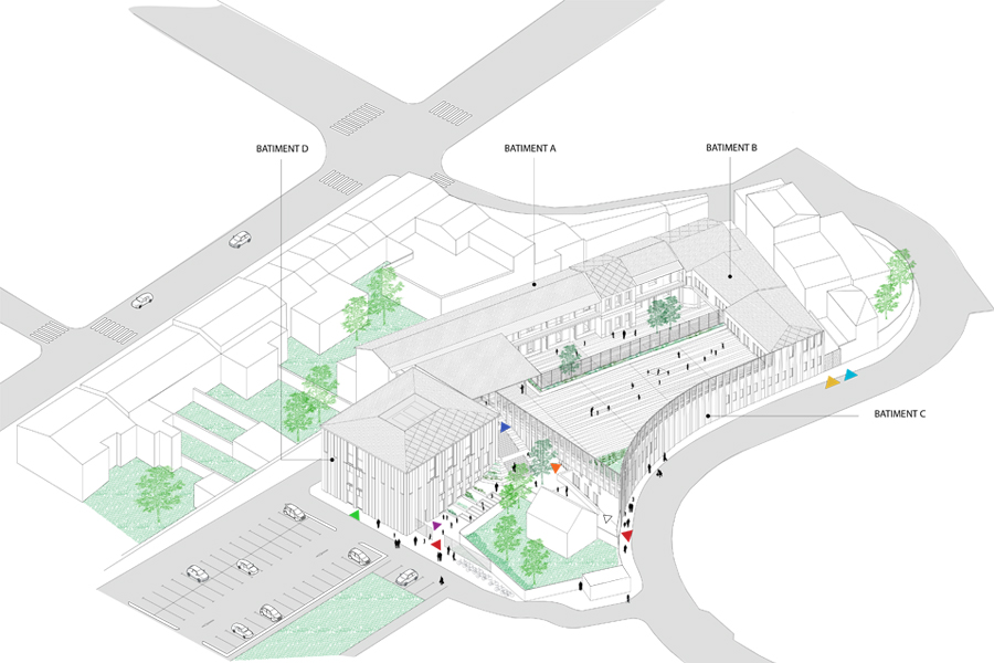 Le rapport entre l’histoire et le futur du quartier, très présent sur cette partie de la ville, a nourri le parti architectural qui nous a guidé. Ainsi, la contrainte de conserver le bâtiment principal de l’école actuelle, l’aile ouest du site, contribue à faire la transition nécessaire entre nouveau et ancien. Même s’il pose des questions de fonctionnalité, ce bâtiment principal permet d’inscrire ce nouveau programme dans l’histoire de l’école et les souvenirs des habitants du quartier.