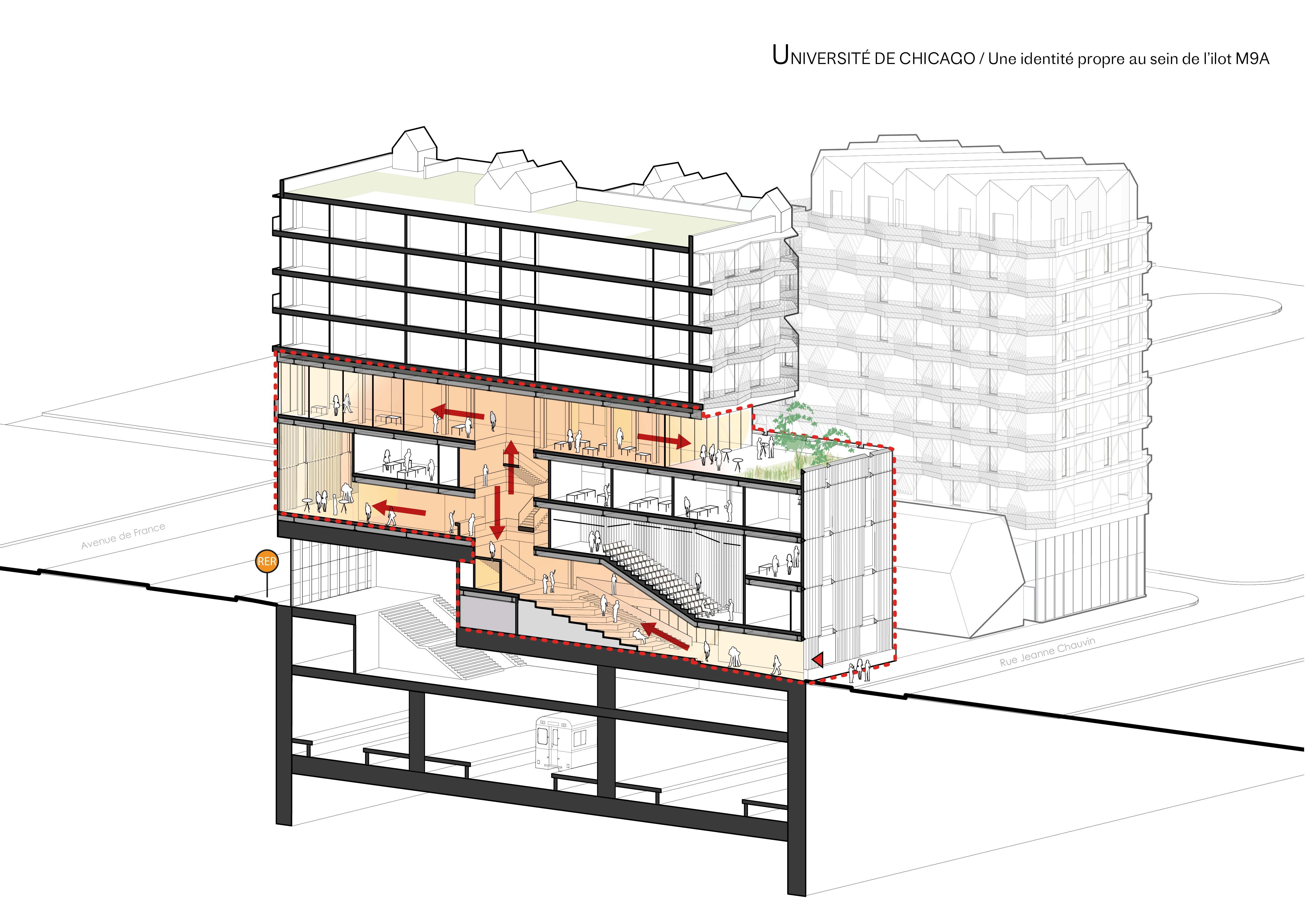 Located along the Avenue de France in the Massena-Chevaleret sector of the 13th arrondissement of Paris, in a dense and evolving urban context, the project has a potential to spread to a district’s scale. On the M9A urban island, we propose the project Maison/Construire with a mixed program gathering the premises of the University of Chicago, 92 dwellings declined in 5 different typologies, a hybrid equipment of shops, researches and innovations, as well as the entrance of RER C.