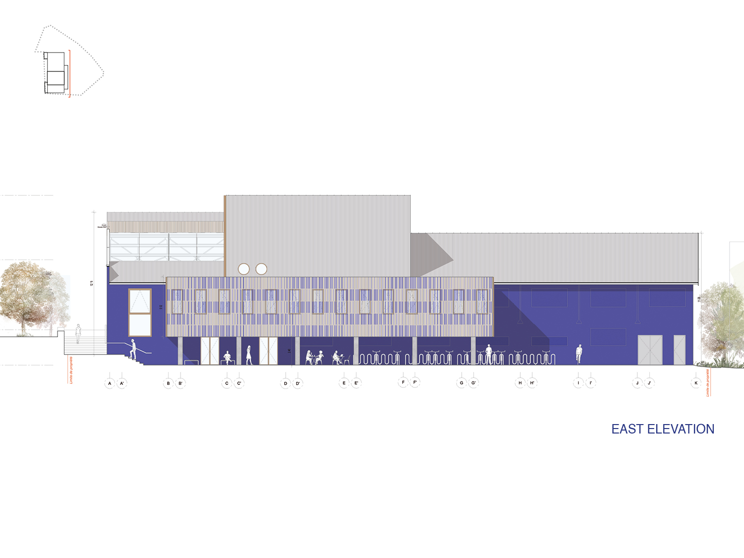 Here we have a project that is expressed in its raw materials with natural aspects and colours. First of all, the new forecourt, as well as the stairs, will be made of reused concrete manufactured on-site, made up of crushed tile aggregates and demolition blocks. Then, the materiality of the facades will also make it possible to distinguish the new extensions from the existing hall: a Timber Frame Facade (FOB) system filled with bio-sourced insulation will be installed. All the new volumes will be insulated from the outside. Conversely, the parts of the old building will be treated in ITI, thanks to its optimal nature for simultaneous thermal and acoustic treatments. The central part of the frame on the reception area will receive a transparent cover in screen-printed ETFE balloons, letting in subdued zenithal light on the convivial areas. All the roofs of the new extensions will receive solar panels, in an attempt to produce the greatest possible quantity of energy on the available surface.
