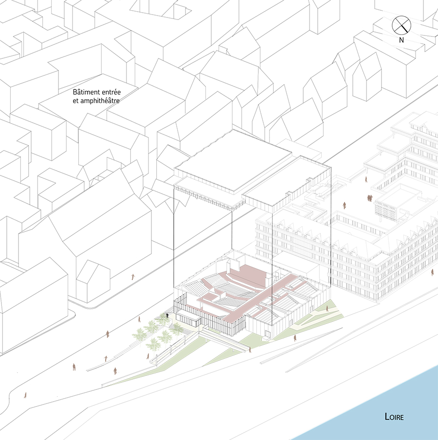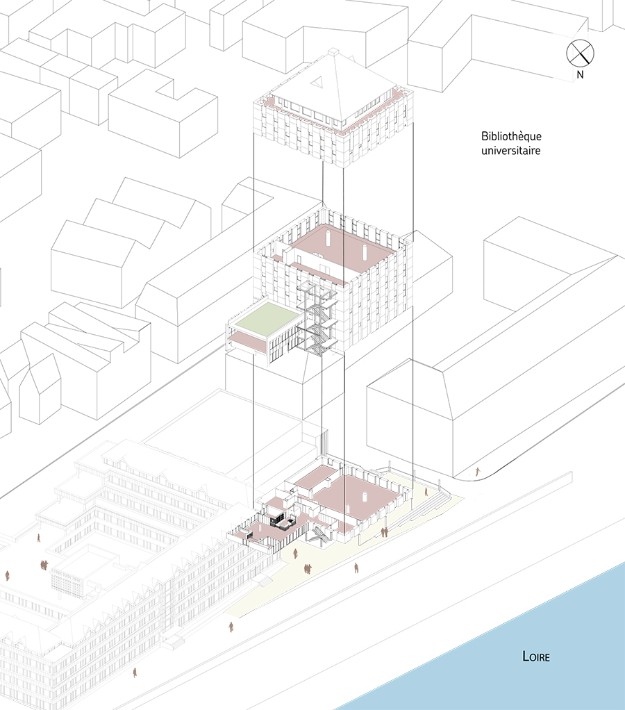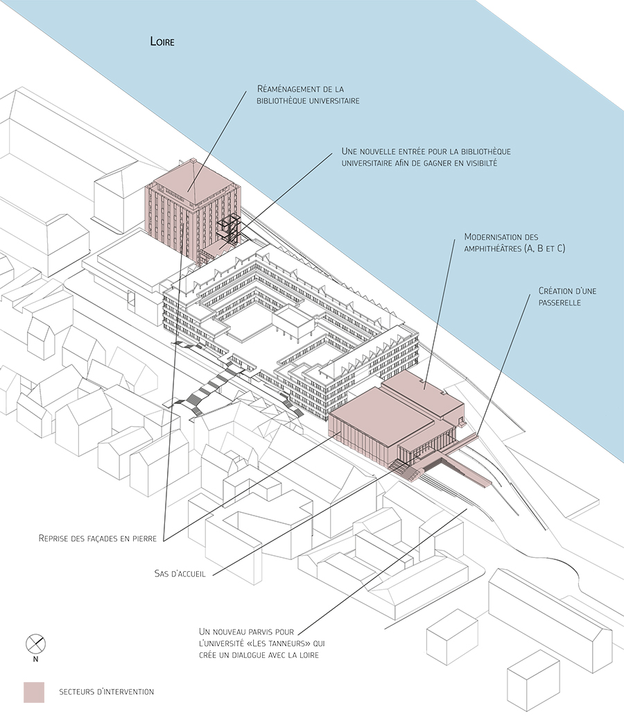 Ici point de grand geste, de la discrétion, les espaces extérieurs et les parvis sont redessinés dans leur intégralité afin de réinscrire le site universitaire dans son contexte urbain entre les quais de la Loire et la vieille ville. Les circulations sont repensées afin de fluidifier les parcours étudiants, tout en améliorant l’accessibilité de tous. Une passerelle reliant le parvis à la Loire permet un accès simplifié au quai.