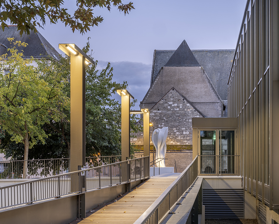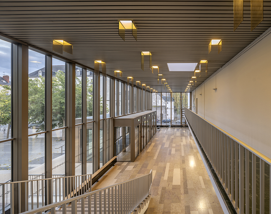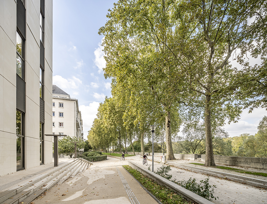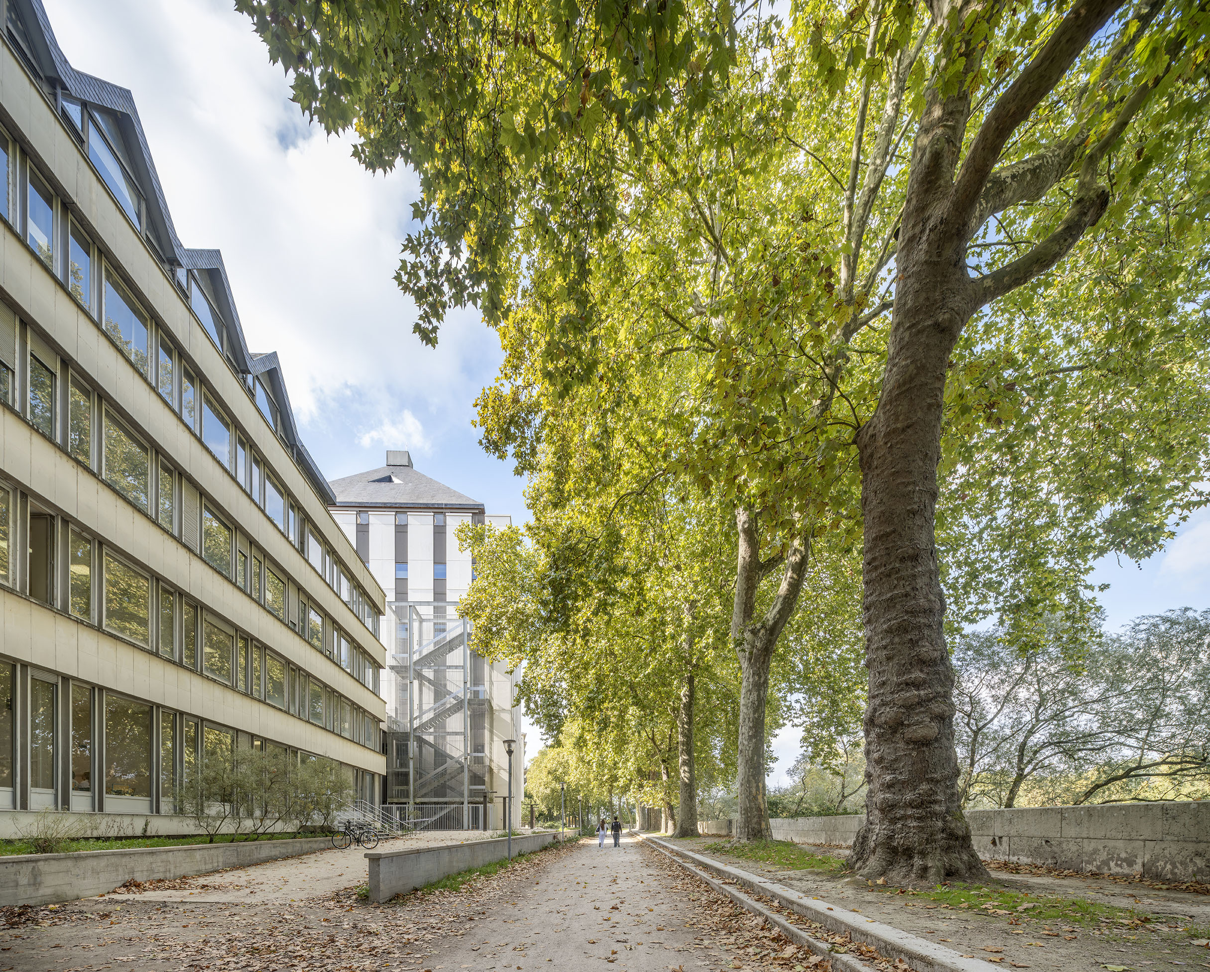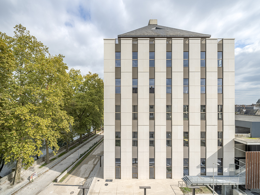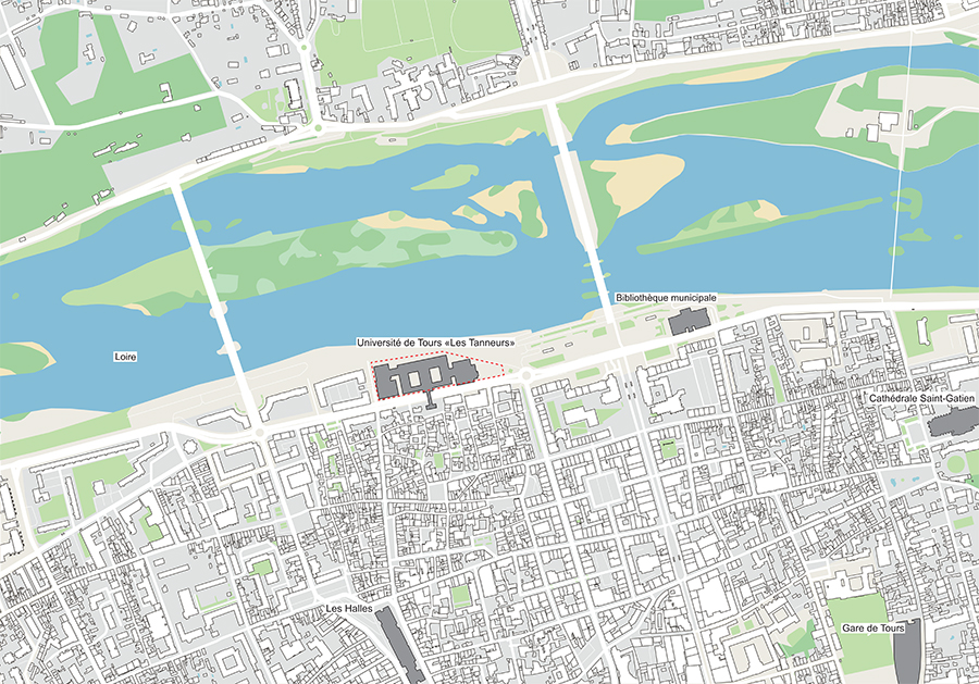 The University of Tours, located on Rue des Tanneurs, occupies a historic site on the banks of the Loire River. It comprises four buildings, designated A, B, C, and D. Buildings B and C house the University Library and student lecture halls, respectively, and date from the early 1970s. Building D includes the main entrance, the Salle Thélème performance hall, and three lecture halls. Our proposal to the client for this project was to work in harmony with the existing buildings and the University. Our work primarily involved restoration: restoring the facades, highlighting the architecture, simplifying circulation routes, and improving the technical aspects of this heritage architectural ensemble and its site. Here, there are no grand gestures, only discretion. The exterior spaces and forecourts have been completely redesigned to reintegrate the university campus into its urban context between the Loire riverbanks and the old town. The circulation patterns have been redesigned to streamline student journeys while improving accessibility for all. A footbridge linking the plaza to the Loire River provides easier access to the quayside.