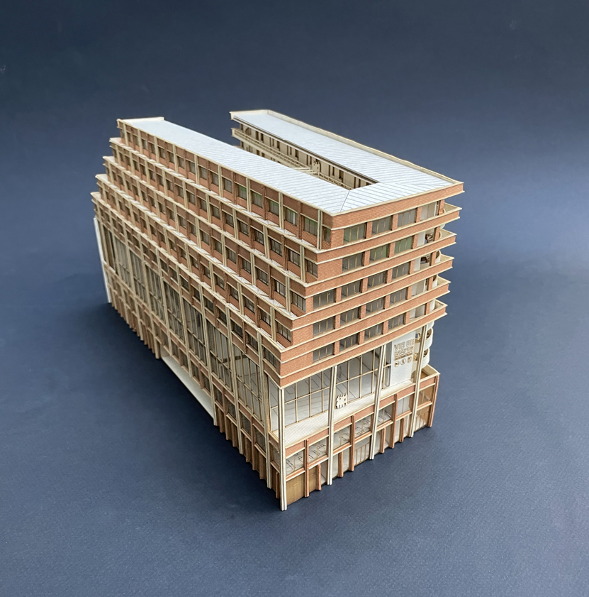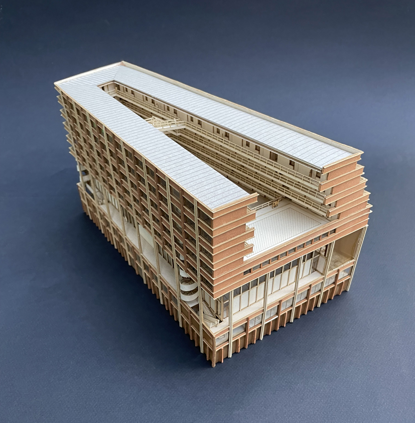 - L’architecture adopte un principe constructif clair et répétitif, qui permet une superposition lisible des fonctions : restauration, sport, logements étudiants, dans un volume compact, évolutif et réversible. Côté Est, le volume en gradins respecte les règles de prospect tout en optimisant l’apport de lumière naturelle et la ventilation dans les logements.
